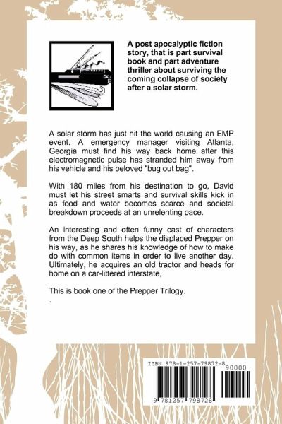A solar storm has just hit the world causing a EMP event. A emergency manager visiting Atlanta GA must find his way back home after this electromagnetic pulse has stranded him away from his vehicle and his beloved ""bug out bag"". With 180 miles to go to his destination, David must let his street smarts and survival skills kick in as food and water becomes scarce and societal breakdown proceeds at an unrelenting pace. An interesting and often funny cast of characters from the Deep South helps the displaced Prepper on his way, as he shares his knowledge of how to make do with common items in order to live another day. Ultimately, he acquires an old tractor and heads for home on a car-littered interstate. This is book one of the Prepper Trilogy.