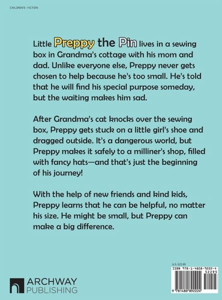 Little Preppy the Pin lives in a sewing box in Grandma's cottage with his mom and dad. Unlike everyone else, Preppy never gets chosen to help because he's too small. He's told that he will find his special purpose someday, but the waiting makes him sad. After Grandma's cat knocks over the sewing box, Preppy gets stuck on a little girl's shoe and dragged outside. It's a dangerous world, but Preppy makes it safely to a milliner's shop, filled with fancy hats-and that's just the beginning of his journey! With the help of new friends and kind kids, Preppy learns that he can be helpful, no matter his size. He might be small, but Preppy can make a big difference.