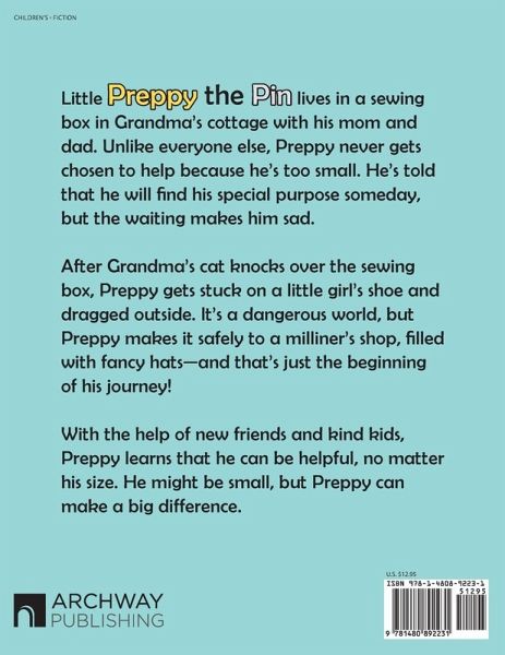 Little Preppy the Pin lives in a sewing box in Grandma's cottage with his mom and dad. Unlike everyone else, Preppy never gets chosen to help because he's too small. He's told that he will find his special purpose someday, but the waiting makes him sad. After Grandma's cat knocks over the sewing box, Preppy gets stuck on a little girl's shoe and dragged outside. It's a dangerous world, but Preppy makes it safely to a milliner's shop, filled with fancy hats-and that's just the beginning of his journey! With the help of new friends and kind kids, Preppy learns that he can be helpful, no matter his size. He might be small, but Preppy can make a big difference.