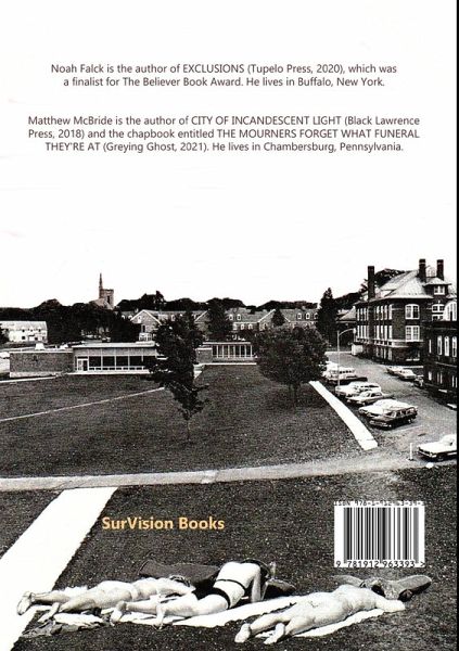 A book of Surrealist poems by two American authors, Noah Falck and Matt McBride working in collaboration. This book won the James Tate Poetry Prize 2022. Noah Falck is the author of "Exclusions" (Tupelo Press, 2020), which was a finalist for The Believer Book Award. He lives in Buffalo, New York. Matthew McBride is the author of City of Incandescent Light (Black Lawrence Press, 2018) and the chapbook entitled The Mourners Forget What Funeral They're At (Greying Ghost, 2021). He lives in Chambersburg, Pennsylvania.