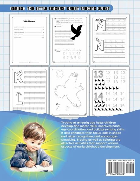 About This Workbook Series "The Little Fingers' Great Tracing Quest" is a fun and interactive series to support preschoolers' learning and development. Designed to foster essential early childhood skills, this series encourages children to trace shapes, letters, numbers, and explore coloring activities. Each workbook of the series focuses on a different theme, such as basic shapes, animals, plants, planets, and everyday objects, along with the alphabet and numbers tracing, offering a comprehensive learning experience that sparks creativity and imagination.More than just an activity book, this series serves as a gateway to cognitive growth, fine motor skills, and early literacy. With every page, children trace, color, and explore the world around them, all while developing crucial skills in a playful, engaging way. Whether used at home or in the classroom, The Little Fingers' Great Tracing Quest provides an enjoyable and enriching experience for young learners, making it a perfect tool for early childhood education. Why Tracing Matters? "The Little Fingers' Great Tracing Quest" Series is more than just an engaging collection of tracing and coloring activities. It's a tool designed to support the key developmental milestones of preschoolers. Through tracing shapes, letters, numbers, and coloring, this series offers a variety of benefits that help young children grow in essential areas: · Fine Motor Skills: By tracing shapes and letters, children strengthen the small muscles in their hands and fingers, which are crucial for later tasks like writing, drawing, and using utensils. · Hand-Eye Coordination: As children trace and color, they practice coordinating their hand movements with what they see, a skill that improves their overall hand-eye coordination and supports their ability to perform tasks with precision. · Pre-Writing Skills: Tracing is an important first step toward writing. By learning to trace letters and shapes, children familiarize themselves with the process of forming symbols, laying the foundation for handwriting. · Focus and Attention: These activities encourage children to concentrate and pay attention to detail, which nurtures their ability to stay focused and build patience, both of which are valuable in all areas of learning. · Shape and Letter Recognition: Each book in the series helps children recognize and become familiar with different shapes, letters, and numbers, essential building blocks for early literacy and math skills. · Creativity and Expression: Tracing and coloring allow children to express themselves and explore their creativity within the structure of each activity. These creative exercises help spark imagination and encourage artistic expression.