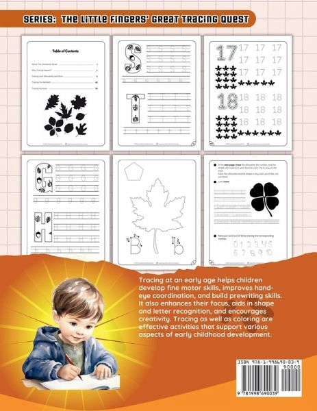 About This Workbook Series "The Little Fingers' Great Tracing Quest" is a fun and interactive series to support preschoolers' learning and development. Designed to foster essential early childhood skills, this series encourages children to trace shapes, letters, numbers, and explore coloring activities. Each workbook of the series focuses on a different theme, such as basic shapes, animals, plants, planets, and everyday objects, along with the alphabet and numbers tracing, offering a comprehensive learning experience that sparks creativity and imagination.More than just an activity book, this series serves as a gateway to cognitive growth, fine motor skills, and early literacy. With every page, children trace, color, and explore the world around them, all while developing crucial skills in a playful, engaging way. Whether used at home or in the classroom, The Little Fingers' Great Tracing Quest provides an enjoyable and enriching experience for young learners, making it a perfect tool for early childhood education.Why Tracing Matters? "The Little Fingers' Great Tracing Quest" Series is more than just an engaging collection of tracing and coloring activities. It's a tool designed to support the key developmental milestones of preschoolers. Through tracing shapes, letters, numbers, and coloring, this series offers a variety of benefits that help young children grow in essential areas: · Fine Motor Skills: By tracing shapes and letters, children strengthen the small muscles in their hands and fingers, which are crucial for later tasks like writing, drawing, and using utensils. · Hand-Eye Coordination: As children trace and color, they practice coordinating their hand movements with what they see, a skill that improves their overall hand-eye coordination and supports their ability to perform tasks with precision. · Pre-Writing Skills: Tracing is an important first step toward writing. By learning to trace letters and shapes, children familiarize themselves with the process of forming symbols, laying the foundation for handwriting. · Focus and Attention: These activities encourage children to concentrate and pay attention to detail, which nurtures their ability to stay focused and build patience, both of which are valuable in all areas of learning. · Shape and Letter Recognition: Each book in the series helps children recognize and become familiar with different shapes, letters, and numbers, essential building blocks for early literacy and math skills. · Creativity and Expression: Tracing and coloring allow children to express themselves and explore their creativity within the structure of each activity. These creative exercises help spark imagination and encourage artistic expression.