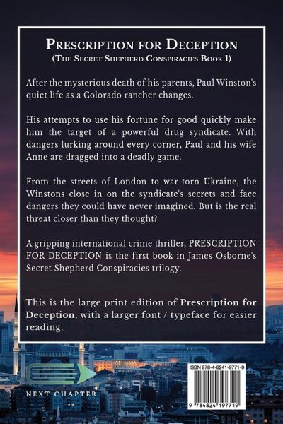After the mysterious death of his parents, Paul Winston's quiet life as a Colorado rancher changes. His attempts to use his fortune for good quickly make him the target of a powerful drug syndicate. With dangers lurking around every corner, Paul and his wife Anne are dragged into a deadly game. From the streets of London to war-torn Ukraine, the Winstons close in on the syndicate's secrets and face dangers they could have never imagined. But is the real threat closer than they thought? A gripping international crime thriller, PRESCRIPTION FOR DECEPTION is the first book in James Osborne's Secret Shepherd Conspiracies trilogy. This is the large print edition of Prescription for Deception, with a larger font / typeface for easier reading.