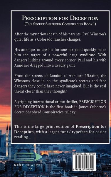 After the mysterious death of his parents, Paul Winston's quiet life as a Colorado rancher changes. His attempts to use his fortune for good quickly make him the target of a powerful drug syndicate. With dangers lurking around every corner, Paul and his wife Anne are dragged into a deadly game. From the streets of London to war-torn Ukraine, the Winstons close in on the syndicate's secrets and face dangers they could have never imagined. But is the real threat closer than they thought? A gripping international crime thriller, PRESCRIPTION FOR DECEPTION is the first book in James Osborne's Secret Shepherd Conspiracies trilogy. This is the large print edition of Prescription for Deception, with a larger font / typeface for easier reading.