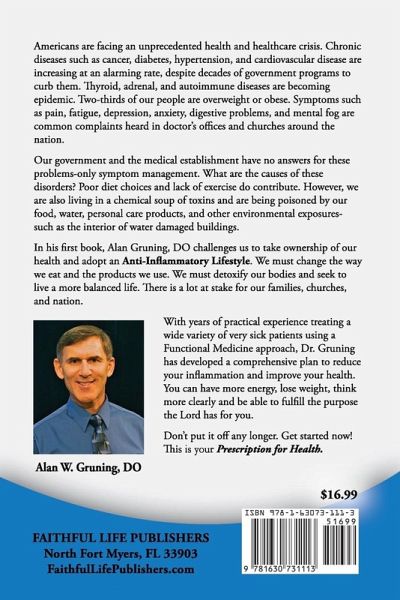 Americans are facing an unprecedented health and healthcare crisis. Chronic diseases such as Cancer, Diabetes, Hypertension, and Cardiovascular Disease are increasing at an alarming rate, despite decades of government programs to curb them. Thyroid, Adrenal, and Autoimmune Diseases are becoming epidemic. Two-thirds of our people are overweight or obese. Symptoms such as pain, fatigue, depression, anxiety, digestive problems, and mental fog are common complaints heard in doctor's offices and churches around the nation. Our government and the medical establishment have no answers for these problems-only symptom management. What are the causes of these disorders? Poor diet choices and lack of exercise do contribute. However, we are also living in a chemical soup of toxins and are being poisoned by our food, water, personal care products, and other environmental exposures- such as the interior of water damaged buildings. In his first book, Alan Gruning, DO challenges us to take ownership of our health and adopt an Anti-Inflammatory Lifestyle. We must change the way we eat and the products we use. We must detoxify our bodies and seek to live a more balanced life. There is a lot at stake for our families, churches, and nation. With years of practical experience treating a wide variety of very sick patients using a Functional Medicine approach, Dr. Gruning has developed a comprehensive plan to reduce your inflammation and improve your health. You can have more energy, lose weight, think more clearly and be able to fulfill the purpose the Lord has for you. Don't put it off any longer. Get started now! This is your Prescription for Health.