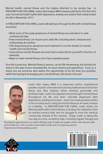 "Option 1: Immediate release to face an uncertain future the second I cleared the heavy industrial glass doors of the hospital. Option 2: Voluntarily admit myself into a psych ward for an unspecified length of time to begin the treatment for my newly-diagnosed mental illnesses." - Justin Alan Hayes, MBA From the author of The House of You®: 5 Workforce Preparation Tips for a Successful Career, Justin Alan Hayes now shares his complete autobiography and mental health journey with you. Captured within these pages are his trials and tribulations on his road to mental health self discovery, healing, and recovery to finally find his Prescription for Living. Take a deep dive into how Justin makes his way through life in his own way, from an ordinary child to successful sports player, to a dedicated student and marketing professional. What awaits is a truly eye-opening account into what it means to fall into crippling self-doubt and isolation, hit the bottom, and bounce back to overcome adversity. You too can learn how to cope and become whole again; to begin surviving and thriving in your life - once you find your Prescription for Living.