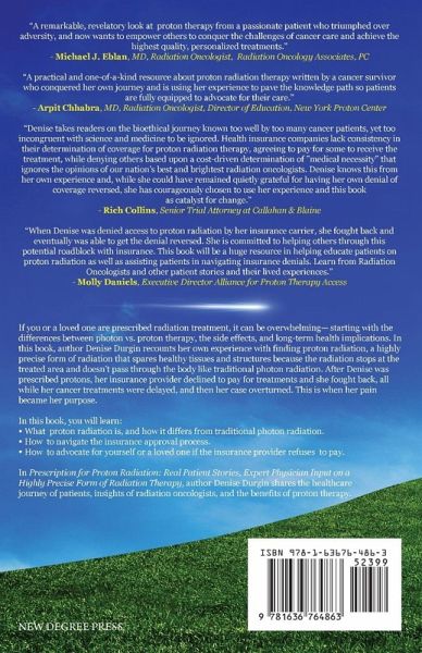 If you or a loved one are prescribed radiation treatment, it can be overwhelming-starting with the differences between photon vs. proton therapy, the side effects, and long-term health implications. In this book, author Denise Durgin recounts her own experience with finding proton radiation, a highly precise form of radiation that spares healthy tissues and structures because the radiation stops at the treated area and doesn't pass through the body like traditional photon radiation. After Denise was prescribed protons, her insurance provider declined to pay for treatments and she fought back, all while her cancer treatments were delayed, and then her case overturned. This is when her pain became her purpose. In this book, you will learn:What proton radiation is, and how it differs from traditional photon radiation. How to navigate the insurance approval process. How to advocate for yourself or a loved one if the insurance provider refuses to pay. In Prescription for Proton Radiation: Real Patient Stories, Expert Physician Input on a Highly Precise Form of Radiation Therapy, author Denise Durgin shares the healthcare journey of patients, insights of radiation oncologists, and the benefits of proton therapy.