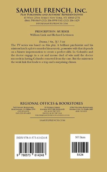 Drama / Characters: 4 males, 3 females Scenery: 3 interiors The TV series was based on this play. A brilliant psychiatrist and his mistress hatch a plot to murder his neurotic, possessive wife that depends on a bizarre impersonation to create a perfect alibi. Lt. Columbo and the doctor engage in a cat and mouse duel of wits until the doctor succeeds in having Columbo removed from the case. But the mistress is the weak link that leads to a trap and a surprising climax.