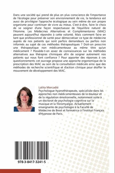 Dans une société qui prend de plus en plus conscience de l'importance de l'écologie pour préserver son environnement de vie, la tendance est aussi de privilégier l'approche écologique au sein même de son propre organisme pour continuer de vivre au mieux. C'est-à-dire, faire le choix de se soigner d'une façon respectueuse de l'équilibre naturel de l'Homme. Les Médecines Alternatives et Complémentaires (MAC) peuvent aujourd'hui répondre à cette volonté. Mais comment faire en tant que professionnel de santé pour démocratiser ce type de médecine auprès de nos patients qui sont parfois demandeurs ou parfois non informés au sujet de ces méthodes thérapeutiques ? Doit-on prescrire une thérapeutique non médicamenteuse au même titre qu'un médicament ? Possède-t-on assez de connaissances sur les méthodes alternatives aux thérapies chimiques afin de soigner autrement nos patients qui nous font confiance ? Pour apporter des réponses à ces questionnements cet ouvrage propose une approche ergonomique de la prescription des MAC au sein de la consultation médicale ainsi que des méthodes de recherche scientifique et d'action clinique pour étoffer le mouvement de développement des MAC.