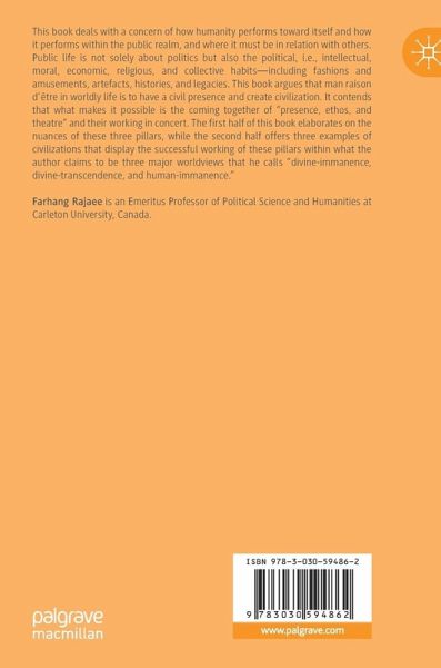 This book deals with a concern of how humanity performs toward itself and how it performs within the public realm, and where it must be in relation with others. Public life is not solely about politics but also the political, i.e., intellectual, moral, economic, religious, and collective habits-including fashions and amusements, artefacts, histories, and legacies. This book argues that man raison d'être in worldly life is to have a civil presence and create civilization. It contends that what makes it possible is the coming together of "presence, ethos, and theatre" and their working in concert. The first half of this book elaborates on the nuances of these three pillars, and the second half offers three examples of civilizations that have succeeded to achieve this within what it claims to be three major worldviews that he calls "divine-immanence, the divine-transcendence, and human-immanence."
