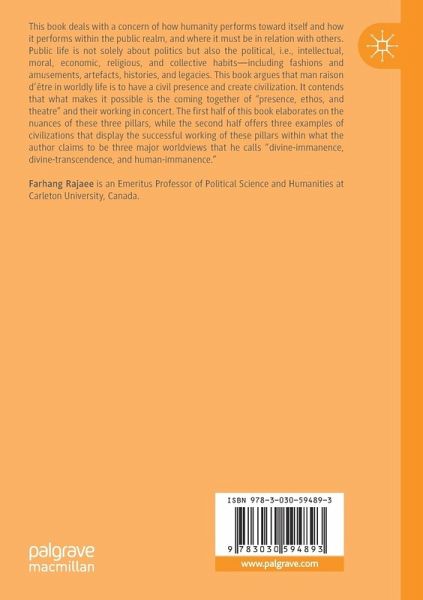 This book deals with a concern of how humanity performs toward itself and how it performs within the public realm, and where it must be in relation with others. Public life is not solely about politics but also the political, i.e., intellectual, moral, economic, religious, and collective habits-including fashions and amusements, artefacts, histories, and legacies. This book argues that man raison d'être in worldly life is to have a civil presence and create civilization. It contends that what makes it possible is the coming together of "presence, ethos, and theatre" and their working in concert. The first half of this book elaborates on the nuances of these three pillars, and the second half offers three examples of civilizations that have succeeded to achieve this within what it claims to be three major worldviews that he calls "divine-immanence, the divine-transcendence, and human-immanence."