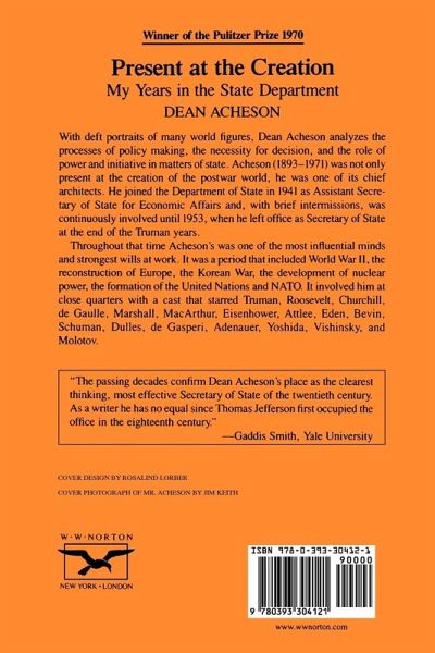 Acheson (1893-1971) was not only present at the creation of the postwar world, he was one of its chief architects. He joined the Department of State in 1941 as Assistant Secretary of State for Economic Affairs and, with brief intermissions, was continuously involved until 1953, when he left office as Secretary of State at the end of the Truman years. Throughout that time Acheson's was one of the most influential minds and strongest wills at work. It was a period that included World War II, the reconstruction of Europe, the Korean War, the development of nuclear power, the formation of the United Nations and NATO. It involved him at close quarters with a cast that starred Truman, Roosevelt, Churchill, de Gaulle, Marshall, MacArthur, Eisenhower, Attlee, Eden Bevin, Schuman, Dulles, de Gasperi, Adenauer, Yoshida, Vishinsky, and Molotov.