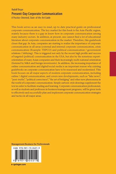 This book serves as an easy-to-read, up-to-date practical guide on professional corporate communication. The key market for this book is the Asia-Pacific region, mainly because there is a gap in know-how in corporate communication among many industry sectors. In addition, at present, one cannot find a lot of educational literature about corporate communication in the market. Therefore, this guidebook closes that gap. In Asia, companies are starting to realize the importance of corporate communication in all areas (external and internal corporate communication, crisis communication (Example: TEPCO) and political communication / government relations / lobbying). This is triggered not only by the recent high profile and success of targeted (political) communication in the USA, but also by the notorious export-orientation of many Asian companies and their increasingly multi-national orientation (fostered by M&A and foreign investments). In addition, the increasing importance of online communication and digital/social media is an important reason why existing guidebooks on corporate communication have to be reassessed and modernized. This book focuses on all major aspects of modern corporate communication, including online / digital communication, and covers new developments, such as "fake news", "post-truths", "political correctness", "the art of bridging" and other new phenomena in the world of (corporate) communication. Simple cartoon-style drawings supplement the text in order to facilitate reading and learning. Corporate communication professional, as well as students and professors in business/management programs, will be given tools to effectively and successfully plan and implement corporate communication strategies and tactics in all major areas.