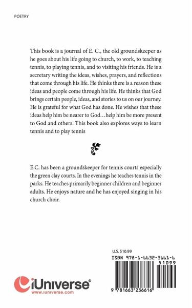 This book is a journal of E. C., the old groundskeeper as he goes about his life going to church, to work, to teaching tennis, to playing tennis, and to visiting his friends. He is a secretary writing the ideas, wishes, prayers, and reflections that come through his life. He thinks there is a reason these ideas and people come through his life. He thinks that God brings certain people, ideas, and stories to us on our journey. He is grateful for what God has done. He wishes that these ideas help him be nearer to God...help him be more present to God and others. This book also explores ways to learn tennis and to play tennis