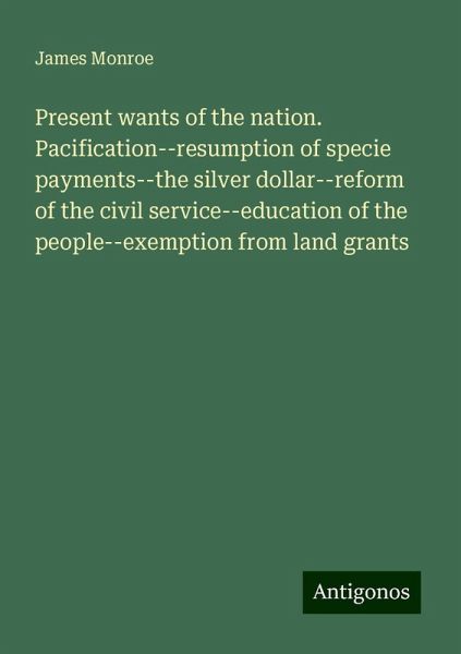Present wants of the nation. Pacification--resumption of specie payments--the silver dollar--reform of the civil service--education of the people--exemption from land grants - Monroe, James