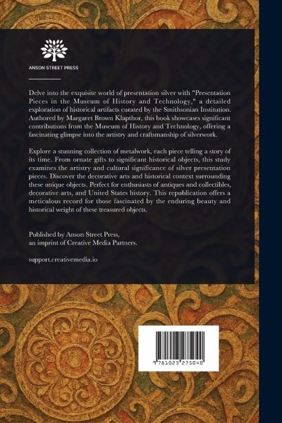 Delve into the exquisite world of presentation silver with "Presentation Pieces in the Museum of History and Technology," a detailed exploration of historical artifacts curated by the Smithsonian Institution. Authored by Margaret Brown Klapthor, this book showcases significant contributions from the Museum of History and Technology, offering a fascinating glimpse into the artistry and craftsmanship of silverwork. Explore a stunning collection of metalwork, each piece telling a story of its time. From ornate gifts to significant historical objects, this study examines the artistry and cultural significance of silver presentation pieces. Discover the decorative arts and historical context surrounding these unique objects. Perfect for enthusiasts of antiques and collectibles, decorative arts, and United States history. This republication offers a meticulous record for those fascinated by the enduring beauty and historical weight of these treasured objects. This work has been selected by scholars as being culturally important, and is part of the knowledge base of civilization as we know it. This work is in the public domain in the United States of America, and possibly other nations. Within the United States, you may freely copy and distribute this work, as no entity (individual or corporate) has a copyright on the body of the work. Scholars believe, and we concur, that this work is important enough to be preserved, reproduced, and made generally available to the public. We appreciate your support of the preservation process, and thank you for being an important part of keeping this knowledge alive and relevant.