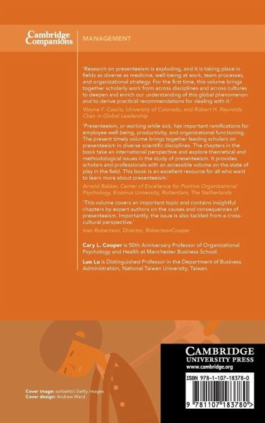Introduction Cary L. Cooper and Luo Lu; Part I. Situating Presenteeism on the Global Stage: Theoretical and Methodological Approaches: 1. presenteeism: an introduction to a prevailing global phenomenon Cary L. Cooper and Maria Karanika-Murray; 2. Presenteeism: a critical review of the literature Mouna Knani, Caroline Biron and Pierre-Sébastien Fournier; 3. Understanding the excessive availability for work in the Confucian Asia: interactions between socio-cultural forces and personal drives Luo Lu and Shu-Fang Kao; Part II. Understanding the Behavior of Presenteeism: 4. Motivation and presenteeism: the whys and whats Jie Ma, Dan Meltzer, Liu-Qin Yang and Cong Liu; 5. The dynamic of assiduity at work: presenteeism and absenteeism Eric Gosselin; 6. Sickness presenteeism and attendance-pressure factors Gunnar Aronsson and Staffan Marklund; 7. Presenteeism in economic research Petri Böckerman; Part III. Understanding the Consequences of Presenteeism: 8. Presenteeism and wellbeing at work Mariella Miraglia and Gary Johns; 9. Presenteeism, burnout and health Aristides I. Ferreira; 10. Presenteeism and innovative behaviour Hsueh-Liang Fan; Part IV. Understanding Presenteeism in Cross-Cultural Context: 11. Presenteeism and work-family/family-work conflict: a cross-cultural approach with two Latin countries Luis F. Martinez, Aristides I. Ferreira and Tânia A. M. Nunes; 12. Presenteeism in the Chinese work context Yanxia Wang, Chih-Chieh Chen and Patricia Fosh.