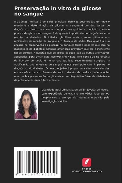 A diabetes mellitus é uma das principais doenças encontradas em todo o mundo e a determinação da glicose no sangue é um dos testes de diagnóstico clínico mais comuns e, por conseguinte, a medição exacta e precisa da glicose no sangue é de grande importância no diagnóstico e na gestão da diabetes. O inibidor glicolítico mais comum utilizado nos recipientes de recolha de sangue é o fluoreto de sódio. Mas qual é a sua eficácia na preservação da glucose no sangue? Qual o impacto que tem no diagnóstico da diabetes? Estudos anteriores provaram que ele é ineficiente nesse sentido. A questão que se coloca é: quais são as outras alternativas adequadas para evitar este inconveniente? Este livro centra-se na eficácia do fluoreto de sódio e numa das técnicas recentemente surgidas "a acidificação das amostras de sangue" e nos seus potenciais impactos no diagnóstico do diabetes. O nosso objetivo é propor uma alternativa simples e mais eficaz para o fluoreto de sódio, através da qual se poderia obter uma melhor preservação da glicemia e um diagnóstico fiável da diabetes e da pré-diabetes num futuro próximo.