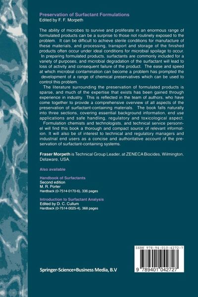 Microbes are known to live in an enormous range of environments. Their ability to survive and proliferate in diverse industrial systems is often a surprise to those not exposed to these problems in their work. These systems contain a range of potential carbon sources, one common theme being surfactants. Surfactants are often not the components most prone to spoilage since some systems contain highly susceptible natural components, such as starch and xanthum gum, but the surfactant is a key part of the formulation, and its extensive breakdown usually means that the material is beyond recovery. The aim of this book is to describe in detail all aspects of the preservation of surfactant containing materials. The book should be viewed as being in three discrete sections. - chapters 1-5 deal with and summarise essential background information - chapters 6-11 discuss in detail various end use applications - chapters 12-15 outline the regulatory and toxicology implication associated withthe safe handling of preservatives Given the format of the book there is inevitably some duplication of information in the middle section with different authors describing essentially the same phenomena but on different substrates. I hope the reader will find that although different chapters touch on the same topics the information around these areas is sufficiently different to justify their inclusion in this book and to be of interest. It should also demonstrate what can be the most useful source of information, the hard practical experience of the authors.