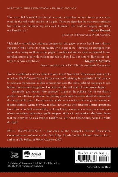 William E. Schmickle, Ph.D., is past chair of the Annapolis Historic Preservation Commission and cofounder of the Oak Ridge, North Carolina, Historic District. His services are available through his website, www.preservationpolitics.com.