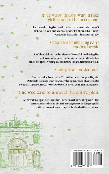 Riley Walsh doesn't want a fake girlfriend but he needs one. It's the only thing he can do to deal with an ex who doesn't believe it's over and years of pining for the most off-limits woman in his world-his sister-in-law. Alexandra Emmerling can't catch a break. She's left picking up the pieces of her ex's humiliating lies and manipulations, rendering her reputation in her ultra-competitive surgical residency program seems beyond repair. A simple arrangement. Two months. Four dates. Five at the most. But possibly six. Definitely no more than six. Only the appearance of a romantic relationship is required. No other benefits involved in this agreement. One weekend to unravel the entire plan. After waking up in bed together-very naked, very hungover-the terms and conditions of their arrangement no longer apply. But that doesn't mean they're finished with each other.