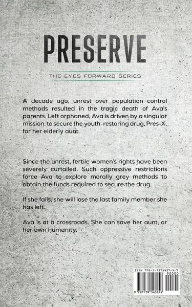 A decade ago, unrest over population control methods resulted in the tragic death of Ava's parents. Left orphaned, Ava is driven by a singular mission: to secure the youth-restoring drug, Pres-X, for her elderly aunt. Since the unrest, fertile women's rights have been severely curtailed. Such oppressive restrictions force Ava to explore morally grey methods to obtain the funds required to secure the drug. If she fails, she will lose the last family member she has left. Ava is at a crossroads. She can save her aunt, or her own humanity.