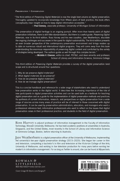 Part I: Why Do We Preserve Digital Materials? Chapter 1: Preservation in the Digital Age Chapter 2: The Need for Digital Preservation Part II: What Digital Materials Are We Preserving? Chapter 3: Digital Artifacts, Digital Objects, Storage Chapter 4: Selection for Preservation Chapter 5: Requirements for Successful Digital Preservation Part III: How Do We Preserve Digital Materials? Chapter 6: Digital Preservation Strategies I Chapter 7: Digital Preservation Strategies II Chapter 8: Case Studies Part IV: Collaboration and the Future Chapter 9: Digital Preservation Initiatives Chapter 10: The Future of Digital Preservation