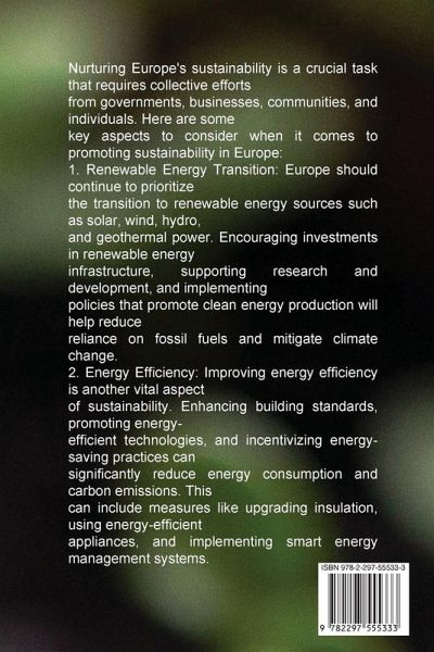 Nurturing Europe's sustainability is a crucial task that requires collective efforts from governments, businesses, communities, and individuals. Here are some key aspects to consider when it comes to promoting sustainability in Europe: Renewable Energy Transition: Europe should continue to prioritize the transition to renewable energy sources such as solar, wind, hydro, and geothermal power. Encouraging investments in renewable energy infrastructure, supporting research and development, and implementing policies that promote clean energy production will help reduce reliance on fossil fuels and mitigate climate change.