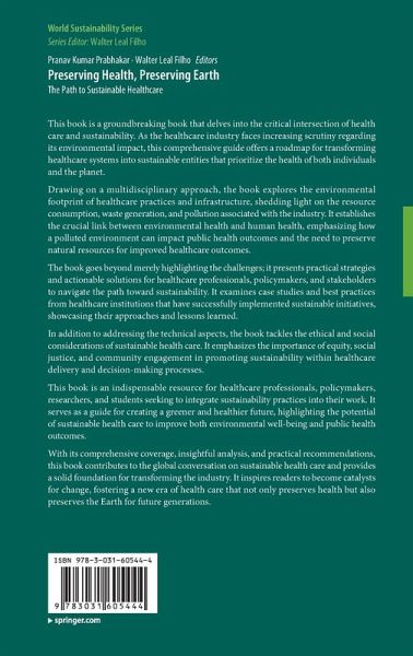 With its comprehensive coverage, insightful analysis,and practical recommendations, this book contributes to the global conversation on sustainable health care and provides a solid foundation for transforming the industry. It inspires readers to become catalysts for change, fostering a new era of health care that not only preserves health but also preserves the Earth for future generations.