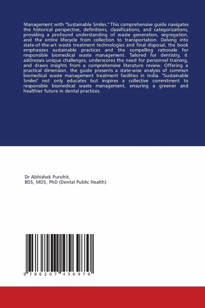 Management with "Sustainable Smiles." This comprehensive guide navigates the historical perspective, definitions, classifications, and categorizations, providing a profound understanding of waste generation, segregation, and the entire lifecycle from collection to transportation. Delving into state-of-the-art waste treatment technologies and final disposal, the book emphasizes sustainable practices and the compelling rationale for responsible biomedical waste management. Tailored for dentistry, it addresses unique challenges, underscores the need for personnel training, and draws insights from a comprehensive literature review. Offering a practical dimension, the guide presents a state-wise analysis of common biomedical waste management treatment facilities in India. "Sustainable Smiles" not only educates but inspires a collective commitment to responsible biomedical waste management, ensuring a greener and healthier future in dental practices.