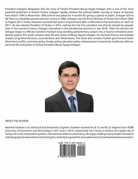 President Erdogan's Biography tells the story of Turkish President Recep Tayyip Erdogan who is one of the most powerful politicians in Turkish history. Erdogan rapidly climbed the political ladder, serving as mayor of Istanbul from March 1994 to November 1998 until he was jailed for 4 months for giving a speech in public. Erdogan led his AK Party to a landslide general election victory in 2002. Erdogan was the Prime Minister of Turkey from March 2003 to August 2014. Turkey adopted a presidential system of goverment after a referendum that took place on April 16, 2017. Erdogan was elected President of Turkey in 2014, making him the first president was directly elected by popular vote in the country's history. Erdogan triumphed in the presidential elections in July 2018. After the election he began to officialy transform Turkey’s long-standing parliamentary system into a heavily centralized presidential system. This book contains early life and career of Recep Tayyip Erdogan, his electoral history and detailed analysis of general elections, local elections and referendums. This book also contains Turkish government-Gulen Movement conflict, economy policy, foreign policy,education policy, infrastructure investments, healthcare reforms, personal life and quotes of Turkish President Recep Tayyip Erdogan.