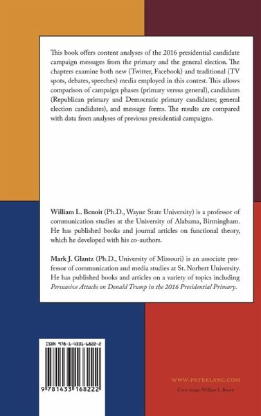 This book offers content analyses of the 2016 presidential candidate campaign messages from the primary and the general election. The chapters examine both new (Twitter, Facebook) and traditional (TV spots, debates, speeches) media employed in this contest. This allows comparison of campaign phases (primary versus general), candidates (Republican primary and Democratic primary candidates; general election candidates), and message forms. The results are compared with data from analyses of previous presidential campaigns.