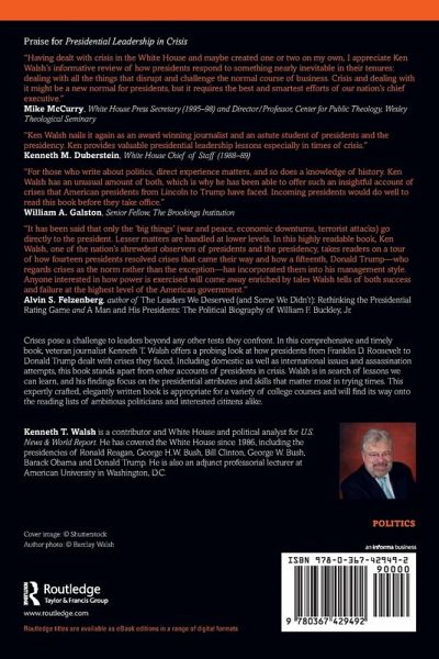 Crises pose a challenge to leaders beyond any other tests they confront. In this comprehensive and timely book, veteran journalist Kenneth T. Walsh offers a probing look at how presidents from Franklin D. Roosevelt to Donald Trump dealt with crises they faced. Including domestic as well as international issues and assassination attempts, this book stands apart from other accounts of presidents in crisis. Walsh is in search of lessons we can learn, and his findings focus on the presidential attributes and skills that matter most in trying times. This expertly crafted, elegantly written book is appropriate for a variety of college courses and will find its way onto the reading lists of ambitious politicians and interested citizens alike.