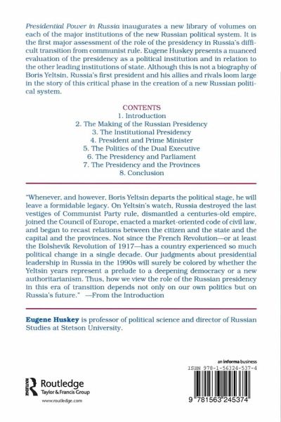 This is the first major assessment of the role of the presidency in Russia's difficult transition form communist rule. Huskey analyzes the establishment and functioning of the Russian presidency as an institution and in relation to the other leading institutions of state: the government, parliament, courts, and regional authorities. Although this is not a biography of the first president, Boris Yeltsin, his allies and his rivals loom large in the study of a critical phase in the creation of a new Russian political system.