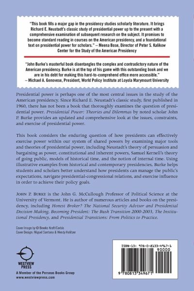 Presidential power is perhaps one of the most central issues in the study of the American presidency. Since Richard E. Neustadt's classic study, first published in 1960, there has not been a book that thoroughly examines the issue of presidential power. Presidential Power: Theories and Dilemmas by noted scholar John P. Burke provides an updated and comprehensive look at the issues, constraints, and exercise of presidential power. This book considers the enduring question of how presidents can effectively exercise power within our system of shared powers by examining major tools and theories of presidential power, including Neustadt's theory of persuasion and bargaining as power, constitutional and inherent powers, Samuel Kernell's theory of going public, models of historical time, and the notion of internal time. Using illustrative examples from historical and contemporary presidencies, Burke helps students and scholars better understand how presidents can manage the public's expectations, navigate presidential-congressional relations, and exercise influence in order to achieve their policy goals.