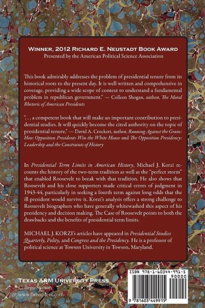 An innovative historical study of the longstanding debate over executive term limits in American politics . . . By successfully seeking a third term in 1940, Franklin D. Roosevelt shattered a tradition that was as old as the American republic. The longstanding yet controversial two-term tradition reflected serious tensions in American political values. In Presidential Term Limits in American History, Michael J. Korzi recounts the history of the two-term tradition as well as the "perfect storm" that enabled Roosevelt to break with that tradition. He also shows that Roosevelt and his close supporters made critical errors of judgment in 1943-44, particularly in seeking a fourth term against long odds that the ill president would survive it. Korzi's analysis offers a strong challenge to Roosevelt biographers who have generally whitewashed this aspect of his presidency and decision making. The case of Roosevelt points to both the drawbacks and the benefits of presidential term limits. Furthermore, Korzi's extended consideration of the seldom-studied Twenty-second Amendment and its passage reveals not only vindictive and political motivations (it was unanimously supported by Republicans), but also a sincere distrust of executive power that dates back to America's colonial and constitutional periods. " . . . a competent book that will make an important contribution to presidential studies. It will quickly become the cited authority on the topic of presidential tenure."-David A. Crockett, author, Running against the Grain: How Opposition Presidents Win the White House and The Opposition Presidency: Leadership and the Constraints of History MICHAEL J. KORZI's articles have appeared in Presidential Studies Quarterly, Polity, and Congress and the Presidency. He is a professor of political science at Towson University in Towson, Maryland.