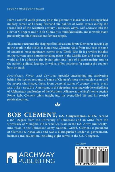From a colorful youth growing up in the governor’s mansion, to a distinguished military career, and seeing firsthand the politics of world events during the second half of the twentieth century, Presidents, Kings, and Convicts tells the story of Congressman Bob Clement’s multifaceted life, and it reveals many previously untold stories about famous people. This memoir narrates the shaping of his life as a moderate Democrat growing up in the south in the 1950s; it shares how Clement had a front-row seat to some of America’s most significant events since World War II; it provides insights on the current crisis situations taking place in the Middle East and around the world; and it addresses the dysfunction and lack of bipartisanship among the nation’s political leaders, as well as offers solutions for getting the country back on track. Presidents, Kings, and Convicts provides entertaining and captivating behind-the-scenes accounts of some of Clement’s most memorable events and the people who shaped them. From personal stories of country music stars and other notable Americans, to the bipartisan meeting with the exiled king of Afghanistan and leaders of the Northern Alliance at the king’s home outside Rome, Italy, Clement offers insight into his event-filled life and his storied political journey.