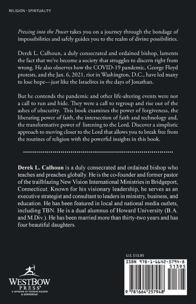 Pressing into the Power takes you on a journey through the bondage of impossibilities and safely guides you to the realm of divine possibilities. Derek L. Calhoun, a duly consecrated and ordained bishop, laments the fact that we've become a society that struggles to discern right from wrong. He also observes how the COVID-19 pandemic, George Floyd protests, and the Jan. 6, 2021, riot in Washington, D.C., have led many to lose hope-just like the Israelites in the days of Jonathan. But he contends the pandemic and other life-altering events were not a call to run and hide. They were a call to regroup and rise out of the ashes of obscurity. This book examines the power of forgiveness, the liberating power of faith, the intersection of faith and technology and, the transformative power of listening to the Lord. Discover a simplistic approach to moving closer to the Lord that allows you to break free from the routines of religion with the powerful insights in this book. Praise for Press into the Power "You can always count on a powerful Word from God through Bishop Calhoun, a spiritual warrior. Press into The Power, is an inspirational tool that guides us on how to stay the course during life's challenges through divine obedience to God. This book will not only encourage and inspire you; it will help you give serious thought as to the purpose of your life and how to follow God's process for growth." -The Honorable Jodi Murray Gregg "... If you are one looking for wisdom on how to navigate the offering of good news afresh in a divided, often hopeless world, I invite you to 'Press into The Power' and watch God do God's mighty work through you. Regardless of your vocation, this is a must read for pandemic faith leaders guiding people through the challenges of what is truly a new world order." -Dr. Joseph W. Daniels, Jr., Lead Pastor, The Emory Fellowship UMC, Washington, D.C., Founder and Board Member, The Emory Beacon of Light, Inc., Washington, D.C. "... If you are disenchanted with life's difficulties, this book will help you correct course. Although the road to purpose is paved with much adversity, Press into The Power reminds us that we can overcome. Through the candid lens of his own trials and triumphs, Bishop Calhoun reveals the path to a victorious life, one principle at a time." -Dexter B. Upshaw Jr., Senior Pastor, New Vision International Ministries, CT., Alumnus, Yale University, TEDx Speaker and Entrepreneur