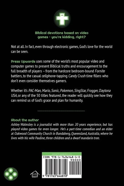 Biblical devotions based on video games - you're kidding, right? Not at all. In fact, even through electronic games, God's love for the world can be seen. Press Upwards uses some of the world's most popular video and computer games to present Biblical truths and encouragement to the full breadth of players - from the hardcore bedroom-bound Fornite battlers, to the casual cellphone-tapping Candy Crush time fillers who don't even consider themselves gamers. Whether it's PAC-Man, Mario, Sonic, Pokemon, SingStar, Frogger, Daytona USA, or any of the 50 titles featured, the reader will quickly see how they can remind us of God's grace and plan for humanity.