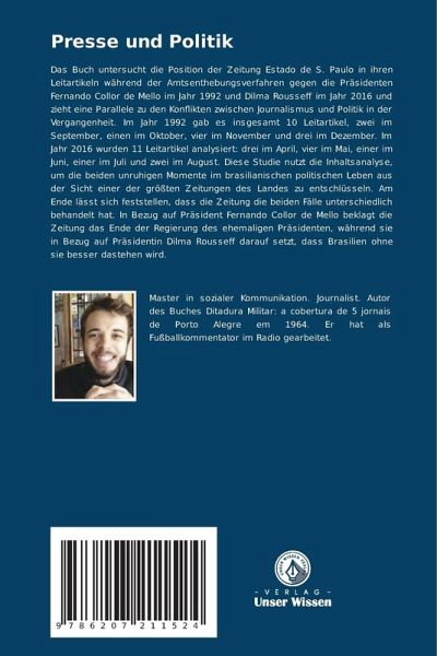 Das Buch untersucht die Position der Zeitung Estado de S. Paulo in ihren Leitartikeln während der Amtsenthebungsverfahren gegen die Präsidenten Fernando Collor de Mello im Jahr 1992 und Dilma Rousseff im Jahr 2016 und zieht eine Parallele zu den Konflikten zwischen Journalismus und Politik in der Vergangenheit. Im Jahr 1992 gab es insgesamt 10 Leitartikel, zwei im September, einen im Oktober, vier im November und drei im Dezember. Im Jahr 2016 wurden 11 Leitartikel analysiert: drei im April, vier im Mai, einer im Juni, einer im Juli und zwei im August. Diese Studie nutzt die Inhaltsanalyse, um die beiden unruhigen Momente im brasilianischen politischen Leben aus der Sicht einer der größten Zeitungen des Landes zu entschlüsseln. Am Ende lässt sich feststellen, dass die Zeitung die beiden Fälle unterschiedlich behandelt hat. In Bezug auf Präsident Fernando Collor de Mello beklagt die Zeitung das Ende der Regierung des ehemaligen Präsidenten, während sie in Bezug auf Präsidentin Dilma Rousseff darauf setzt, dass Brasilien ohne sie besser dastehen wird.