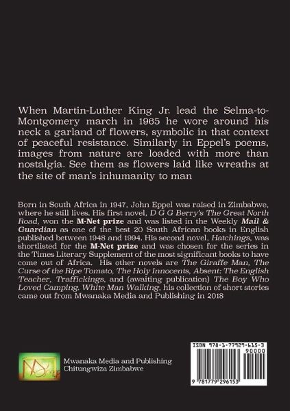 Eppel's poems are images from nature and loaded with more than nostalgia. See them as flowers laid like wreaths at the site of man's inhumanity to man. Born in South Africa in 1947, John Eppel was raised in Zimbabwe, where he still lives. His first novel, D G G Berry's The Great North Road, won the M-Net prize and was listed in the Weekly Mail & Guardian as one of the best 20 South African books in English published between 1948 and 1994.