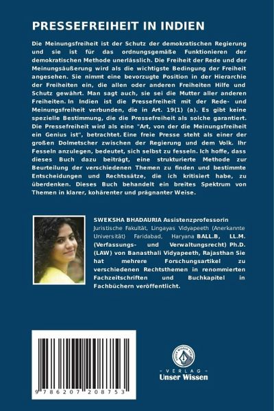 Die Meinungsfreiheit ist der Schutz der demokratischen Regierung und sie ist für das ordnungsgemäße Funktionieren der demokratischen Methode unerlässlich. Die Freiheit der Rede und der Meinungsäußerung wird als die wichtigste Bedingung der Freiheit angesehen. Sie nimmt eine bevorzugte Position in der Hierarchie der Freiheiten ein, die allen oder anderen Freiheiten Hilfe und Schutz gewährt. Man sagt auch, sie sei die Mutter aller anderen Freiheiten. In Indien ist die Pressefreiheit mit der Rede- und Meinungsfreiheit verbunden, die in Art. 19(1) (a). Es gibt keine spezielle Bestimmung, die die Pressefreiheit als solche garantiert. Die Pressefreiheit wird als eine "Art, von der die Meinungsfreiheit ein Genius ist", betrachtet. Eine freie Presse steht als einer der großen Dolmetscher zwischen der Regierung und dem Volk. Ihr Fesseln anzulegen, bedeutet, sich selbst zu fesseln. Ich hoffe, dass dieses Buch dazu beiträgt, eine strukturierte Methode zur Beurteilung der verschiedenen Themen zu finden und bestimmte Entscheidungen und Rechtssätze, die ich kritisiert habe, zu überdenken. Dieses Buch behandelt ein breites Spektrum von Themen in klarer, kohärenter und prägnanter Weise.