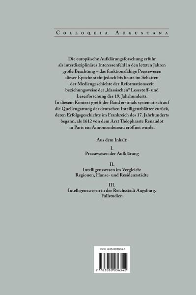 Die europäische Aufklärungsforschung erfuhr als interdisziplinäres Interessenfeld in den letzten Jahren große Beachtung - das funktionsfähige Pressewesen dieser Epoche steht jedoch bis heute im Schatten der Mediengeschichte der Reformationszeit beziehungsweise der "klassischen" Lesestoff- und Leserforschung des 19. Jahrhunderts. In diesem Kontext greift der Band erstmals systematisch auf die Quellengattung der deutschen Intelligenzblätter zurück, deren Erfolgsgeschichte im Frankreich des 17. Jahrhunderts begann, als 1612 von dem Arzt Theophraste Renandot in Paris ein Annoncenbureau eröffnet wurde.