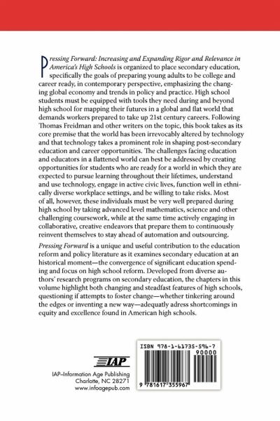 Pressing Forward: Increasing and Expanding Rigor and Relevance in America's High Schools is organized to place secondary education, specifically the goals of preparing young adults to be college and career ready, in contemporary perspective, emphasizing the changing global economy and trends in policy and practice. High school students must be equipped with tools they need during and beyond high school for mapping their futures in a global and flat world that demands workers prepared to take up 21st century careers. Following Thomas Freidman and other writers on the topic, this book takes as its core premise that the world has been irrevocably altered by technology and that technology takes a prominent role in shaping post-secondary education and career opportunities. The challenges facing education and educators in a flattened world can best be addressed by creating opportunities for students who are ready for a world in which they are expected to pursue learning throughout their lifetimes, understand and use technology, engage in active civic lives, function well in diverse workplace settings, and be willing to take risks. Most of all, however, these individuals must be very well prepared during high school by taking advanced level mathematics, science and other challenging coursework, while at the same time actively engaging in collaborative, creative endeavors that prepare them to continuously reinvent themselves to stay ahead of automation and outsourcing. The book will be a unique and useful contribution to the education reform and policy literature as it examines secondary education at an historical moment-the convergence of significant education spending and focus on high school reform. Developed from diverse authors' research programs on secondary education, the chapters in this volume highlight both changing and steadfast features of high schools, questioning if attempts to foster change-whether tinkering around the edges or inventing a new way-adequately address shortcomings in equity and excellence found in American high schools.