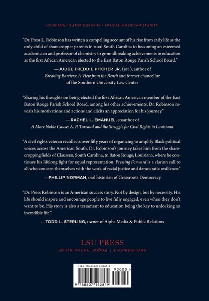 In this down-to-earth memoir, longtime educator and community leader Press L. Robinson Sr. recounts his hardscrabble childhood in South Carolina, his education at Morehouse College and Howard University, his career as a professor and administrator in the Southern University system, and his activities as a community leader in Baton Rouge, Louisiana. The first elected Black member of the East Baton Rouge Parish School Board, Robinson consistently fought to level the playing fields for Black Americans and to better the social and physical environment of his adopted city.