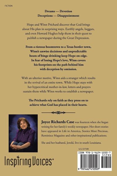 Dreams — Devotion Deceptions — Disappointment Hope and Winn Prichard discover that God brings about His plan in surprising ways. Earthly angels, beggars, and even Howard Hughes help them in their quest to publish a newspaper during the Great Depression. From a riotous boomtown to a Texas border town, Winn’s unwise decisions and unpredictable bouts of binge drinking keep Hope on edge. In fear of losing Hope’s love, Winn covers his footprints on the path behind him with deception by omission. With an ulterior motive, Winn aids a stranger which results in the revival of an entire town. While Hope stays with her hypercritical mother-in-law, letters and prayers sustain them while Winn works to establish a newspaper. The Prichards rely on faith as they press on to achieve what God has placed in their hearts.