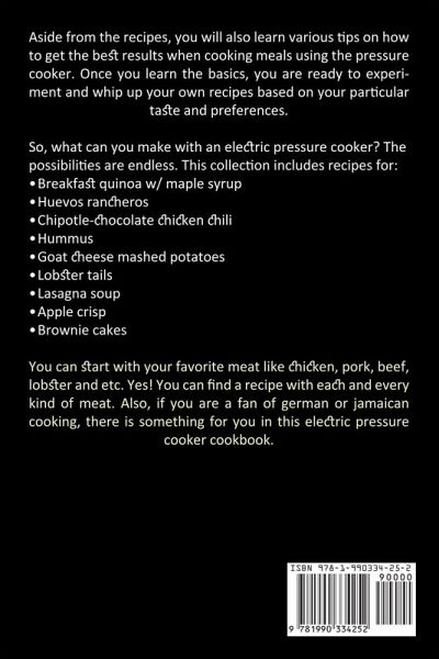 Aside from the recipes, you will also learn various tips on how to get the best results when cooking meals using the pressure cooker. Once you learn the basics, you are ready to experiment and whip up your own recipes based on your particular taste and preferences. So, what can you make with an electric pressure cooker? The possibilities are endless. This collection includes recipes for: ¿ Breakfast quinoa w/ maple syrup ¿ Huevos rancheros ¿ Chipotle-chocolate chicken chili ¿ Hummus ¿ Goat cheese mashed potatoes ¿ Lobster tails ¿ Lasagna soup ¿ Apple crisp ¿ Brownie cakes You can start with your favorite meat like chicken, pork, beef, lobster and etc. Yes! You can find a recipe with each and every kind of meat. Also, if you are a fan of german or jamaican cooking, there is something for you in this electric pressure cooker cookbook.