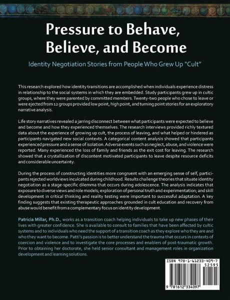 This research explored how identity transitions are accomplished when individuals experience distress in relationship to the social systems in which they are embedded. Study participants grew up in cultic groups, where they were parented by committed members. Twenty-two people who chose to leave or were ejected from 12 groups provided low point, high point, and turning point stories for an exploratory narrative analysis. Life story narratives revealed a jarring disconnect between what participants were expected to believe and become and how they experienced themselves. The research interviews provided richly textured data about the experience of growing up cult, the process of leaving, and what helped or hindered as participants navigated new social contexts. A categorical content analysis showed that participants experienced pressure and a sense of isolation. Adverse events such as neglect, abuse, and violence were reported. Many experienced the loss of family and friends as the exit cost for leaving. The research showed that a crystallization of discontent motivated participants to leave despite resource deficits and considerable uncertainty. During the process of constructing identities more congruent with an emerging sense of self, participants rejected worldviews inculcated during childhood. Results challenge theories that situate identity negotiation as a stage-specific dilemma that occurs during adolescence. The analysis indicates that exposure to diverse views and role models; exploration of personal truth and experimentation; and skill development in critical thinking and reality testing were important to successful adaptation. A key finding suggests that existing therapeutic approaches grounded in cult education and recovery from abuse would benefit from a complementary focus on identity development.
