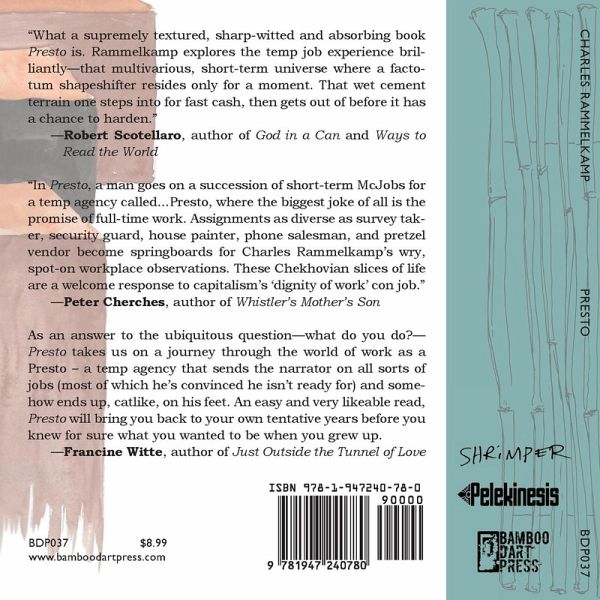 Presto chronicles the adventures of an employee for a temp agency as he goes out on what often seem like absurd assignments for which he occasionally has to make up the rules as he goes along, improvise. As the sequence deepens, we see this unidentified character in later work situations. His attitude seems unchanged as he deals with the absurdities life throws his way.