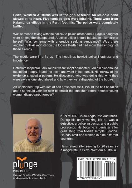 Perth, Western Australia was in the grip of terror. An ice-cold hand clawed at its heart. Five teenage girls were missing. Three were from Kalamunda village in the Perth foothills. The police were completely baffled. Was someone toying with the police? A police officer and a judge’s daughter were among the disappeared. A police officer should be able to take care of herself. Was someone with a grudge seeking vengeance? Was there another thrill-kill monster on the loose? Perth had had more than enough of those already. The media were in a frenzy. The headlines howled police ineptness and impotence. Detective Inspector Jack Kelpie wasn’t inept or impotent. An old bloodhound he sniffed deeply, found the scent and went in hot pursuit. His review of the evidence showed a pattern. He discovered who was doing this, why they were always one step ahead and how they were disposing of the bodies. An unplanned trap with lots of bait presented itself. Would the bait be taken and if so would Jack be able to snatch the snatcher before another young woman disappeared forever?